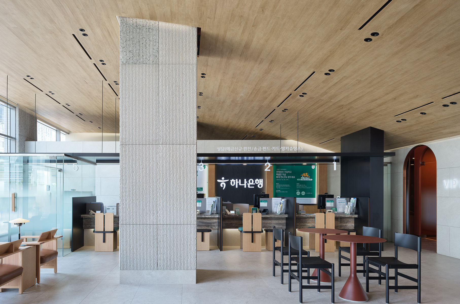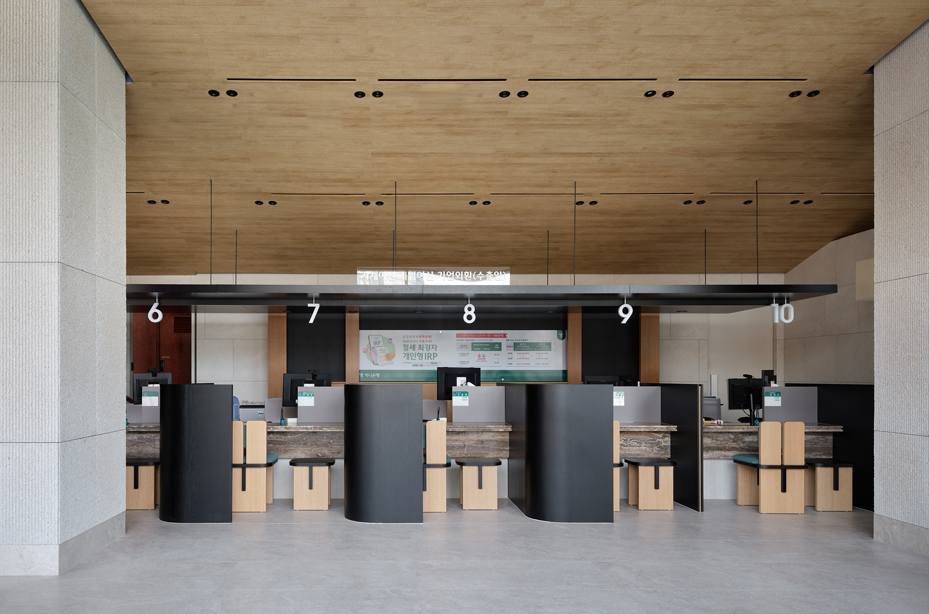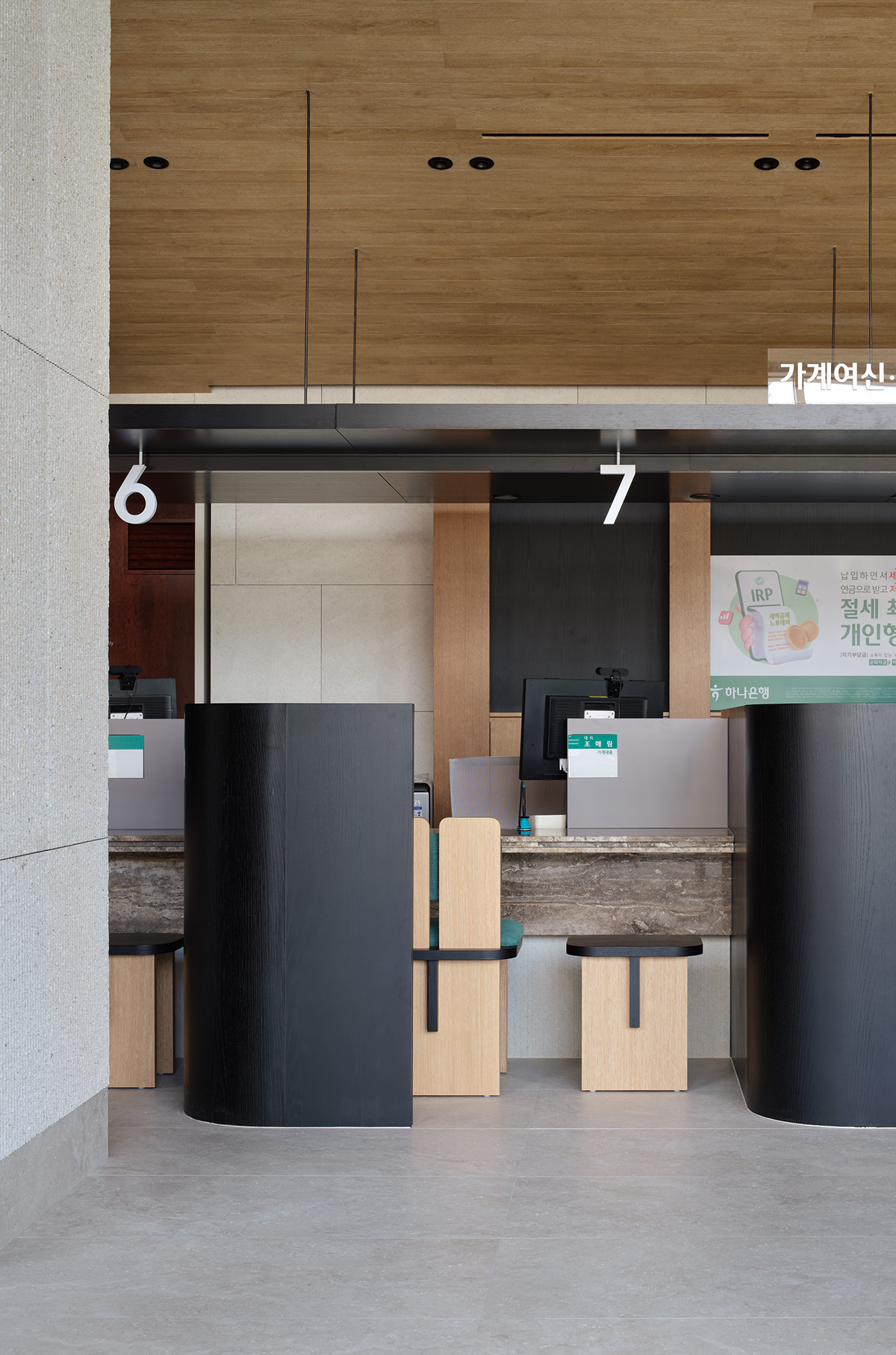은행 창구 공간은 설계 기준에 맞춰 밝은 조도를 유지하기 위해 낮은 천장 높이를 적용하고, 이에 맞춰 가벼운 느낌의 지붕을 설계했다. 창구 가구 디자인도 함께 맡아, 고객을 아늑하게 감싸는 벽 형태와 의자 쿠션에 하나은행의 상징 색인 녹색을 사용해, 창구 공간 전체가 하나은행 브랜드 이미지와 어우러지며 편안하고 고급스러운 분위기를 조성했다.