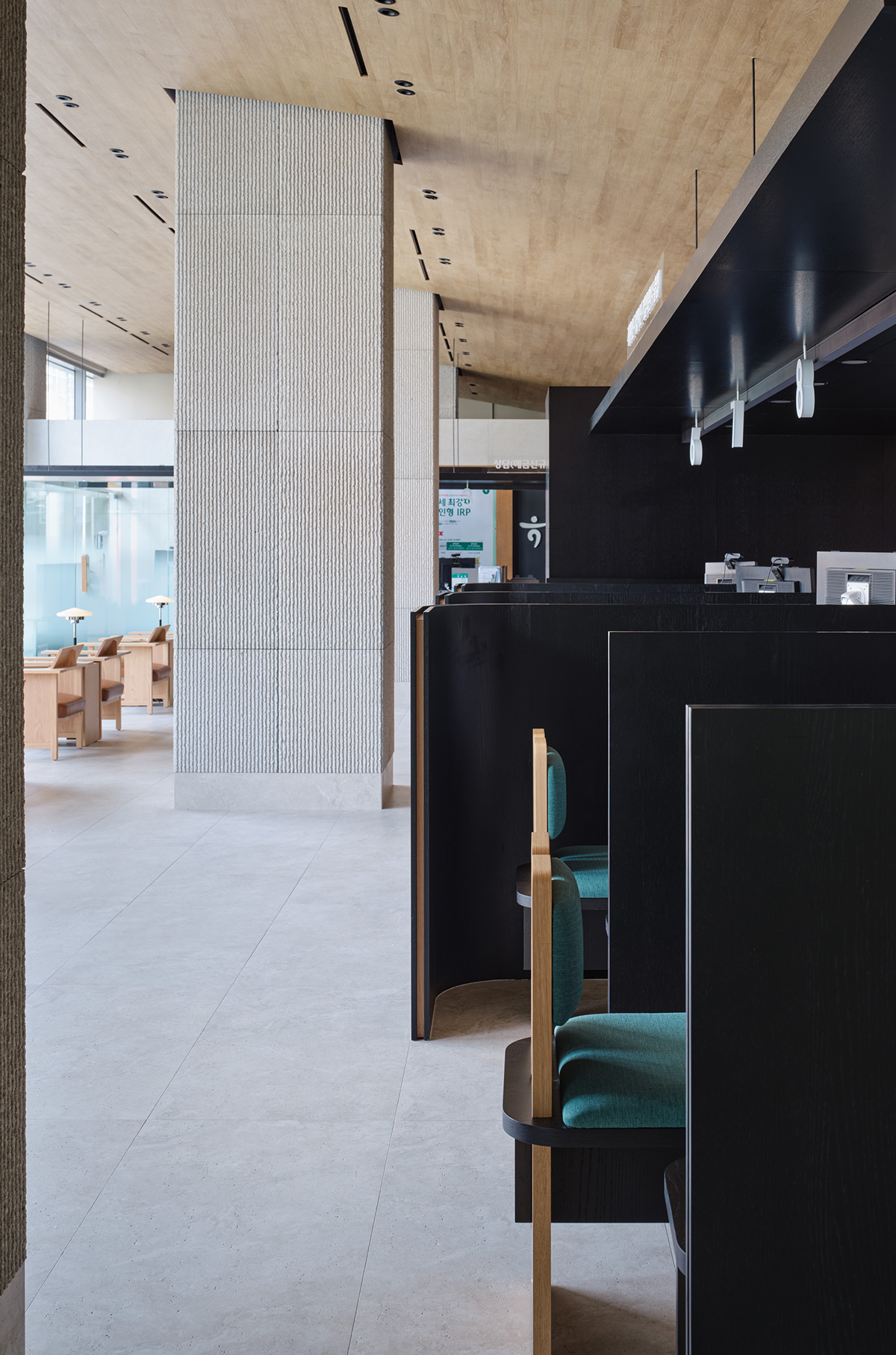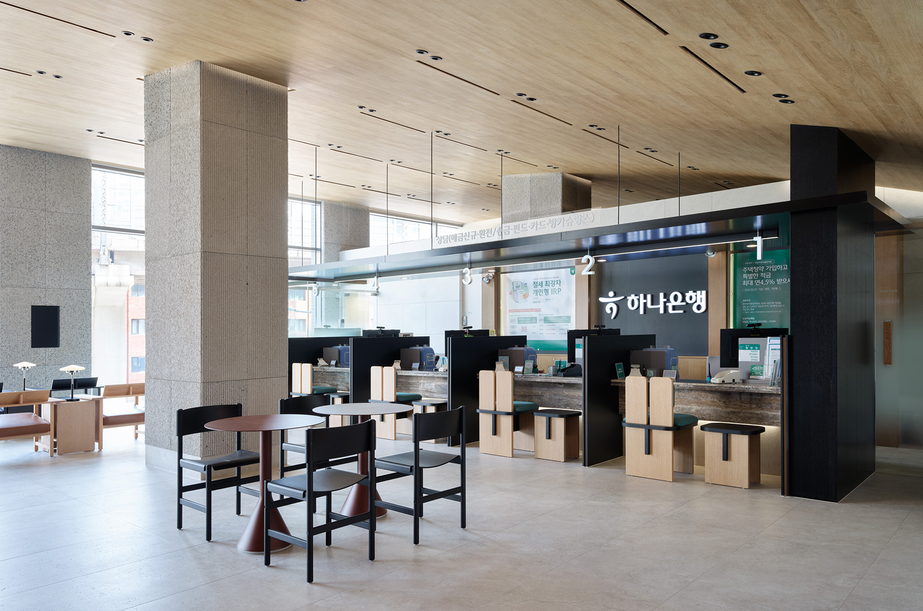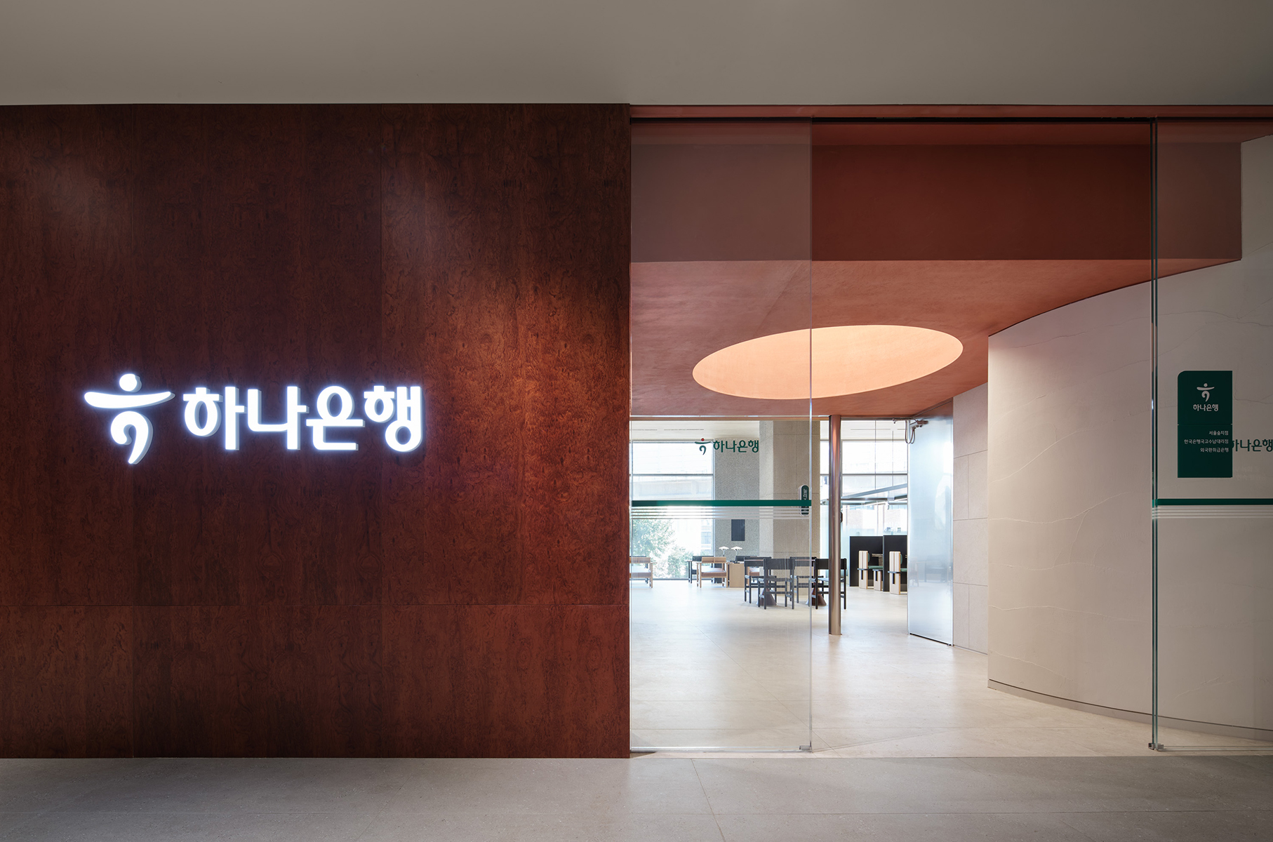 은행 창구 공간은 설계 기준에 맞춰 밝은 조도를 유지하기 위해 낮은 천장 높이를 적용하고, 이에 맞춰 가벼운 느낌의 지붕을 설계했다. 창구 가구 디자인도 함께 맡아, 고객을 아늑하게 감싸는 벽 형태와 의자 쿠션에 하나은행의 상징 색인 녹색을 사용해, 창구 공간 전체가 하나은행 브랜드 이미지와 어우러지며 편안하고 고급스러운 분위기를 조성했다.