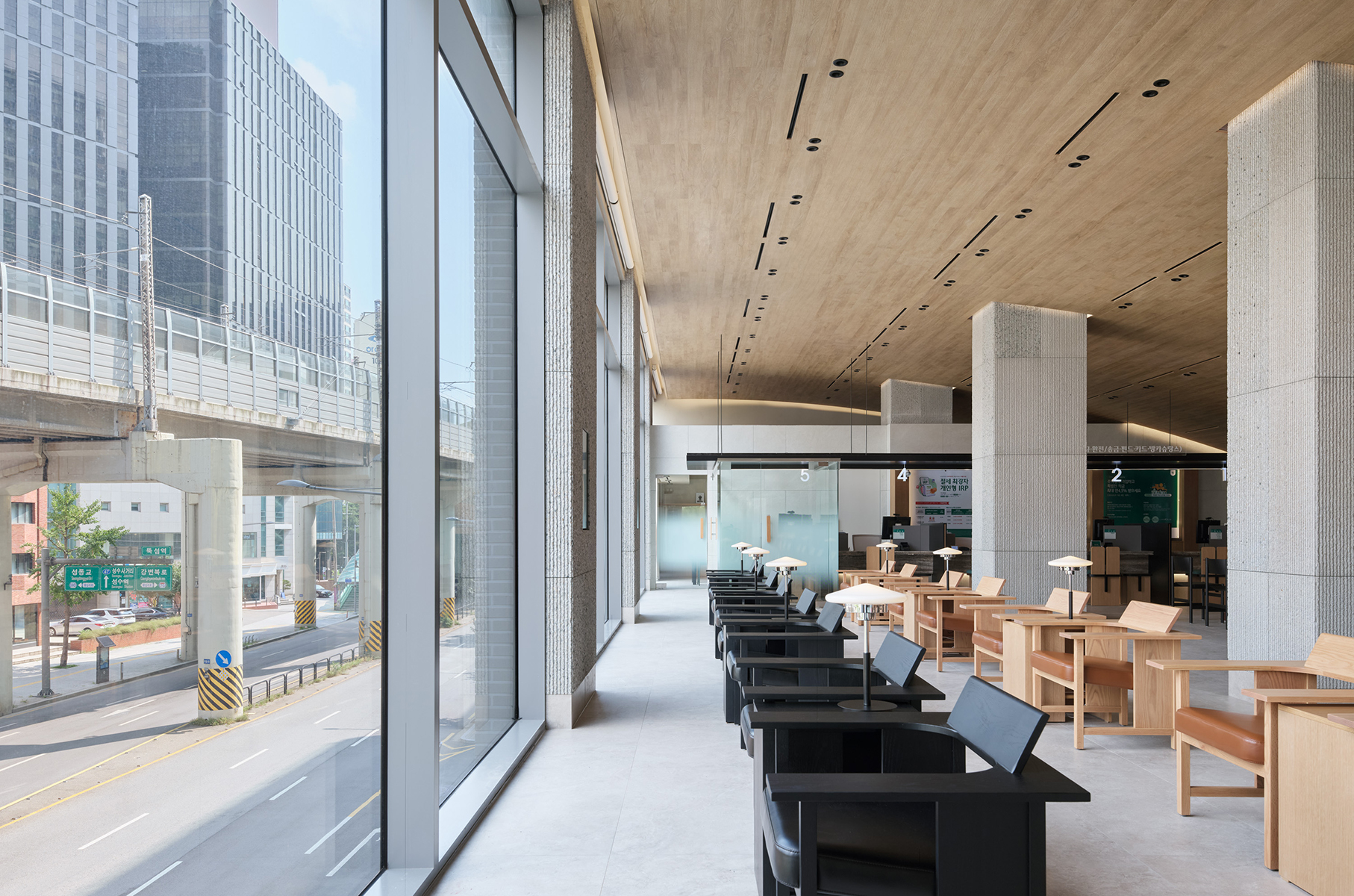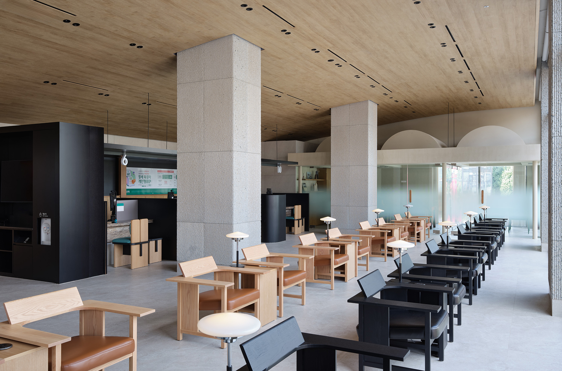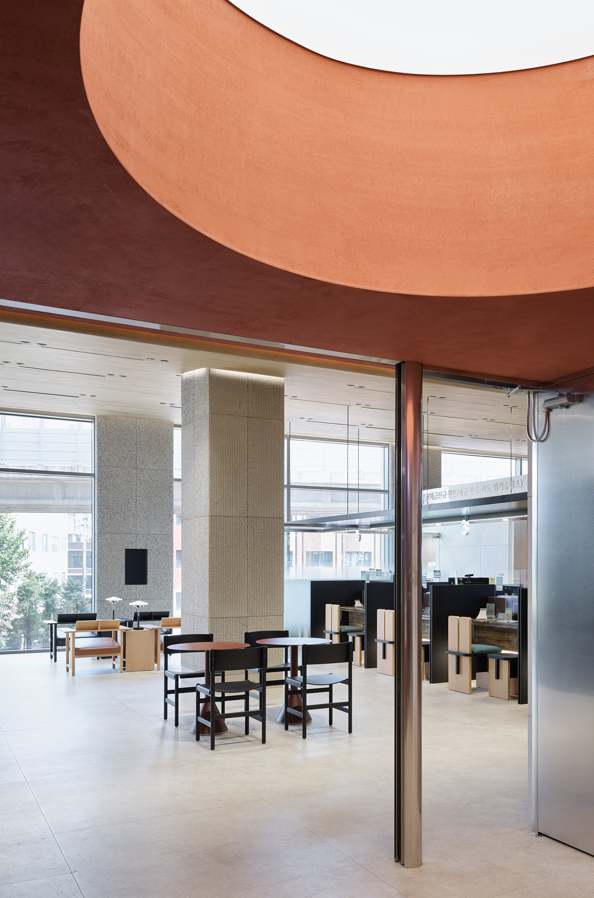전체적인 공간의 리듬을 형성하는 요소는 높은 층고의 지붕과 중앙에 자리한 네 개의 기둥이다. 유려한 포물선 형태의 지붕과 네 개의 기둥이 조화를 이루며 공간에 개방감과 깊이를 더해준다. 특히 건물의 중심을 지탱하는 네 개의 기둥은 층고를 따라 위로 뻗어 지붕을 받치고, 상부 천장과 분리되어 있어 개방적인 분위기를 만들어낸다. 각 기둥에는 순서를 확인할 수 있는 디스플레이가 설치 되어 있어, 고객들이 대기 중에도 창밖의 경관을 감상하며 순서를 확인할 수 있는 효율적인 공간으로 구성되어 있다.