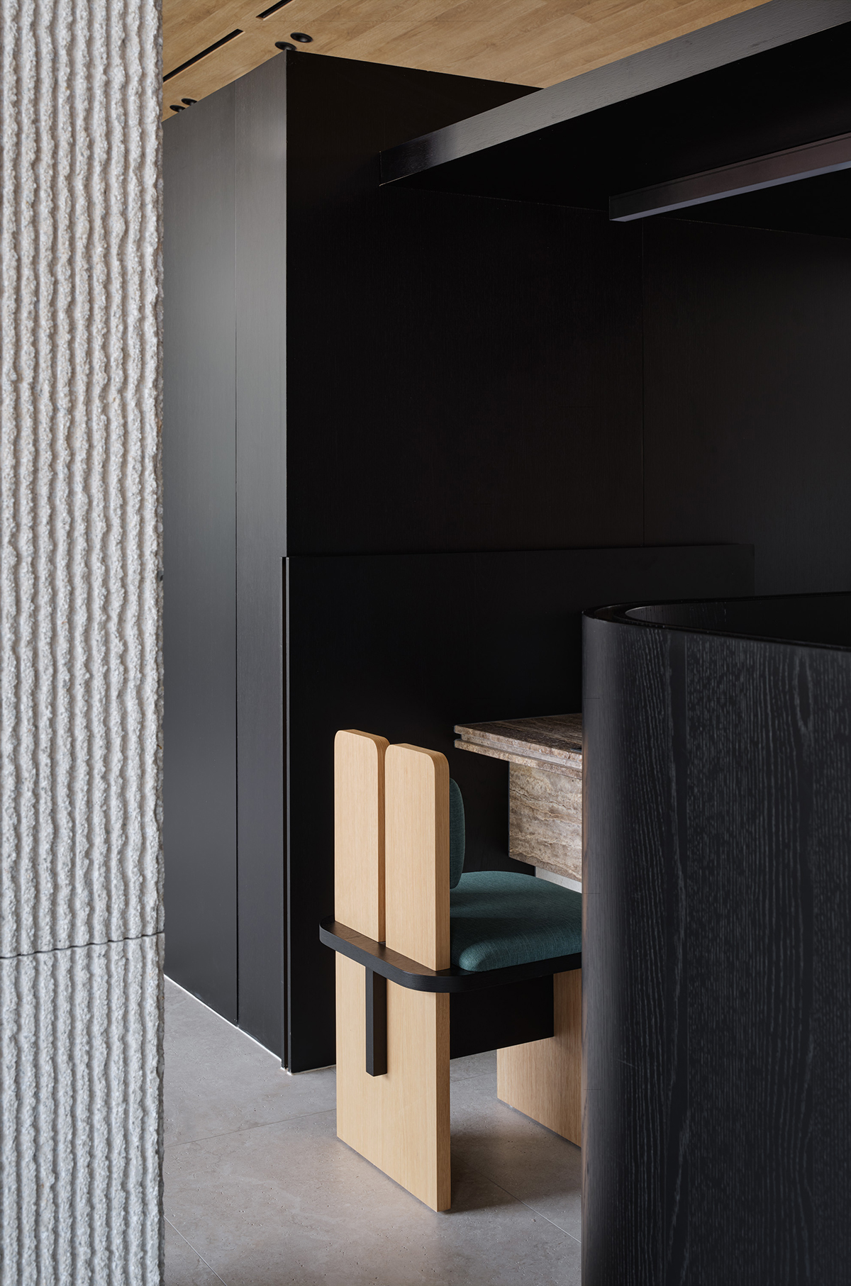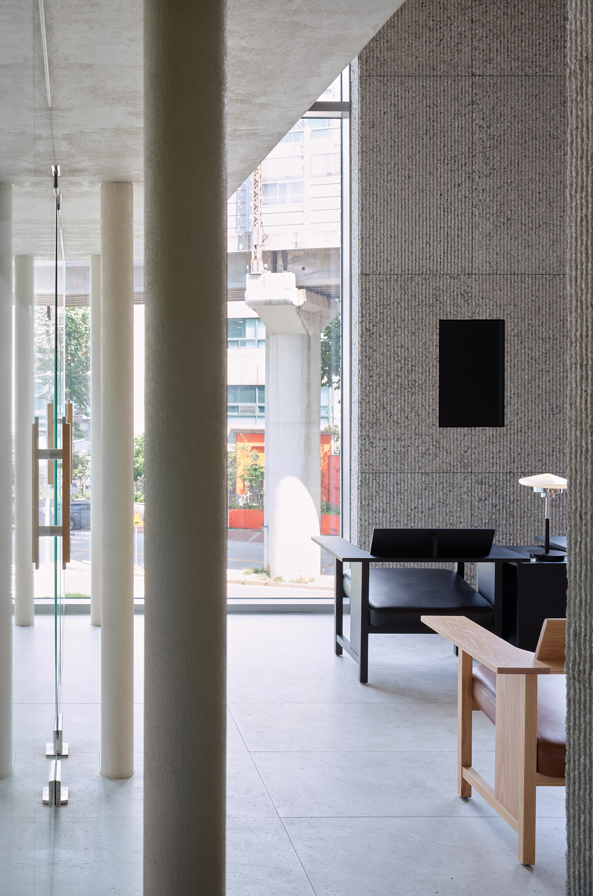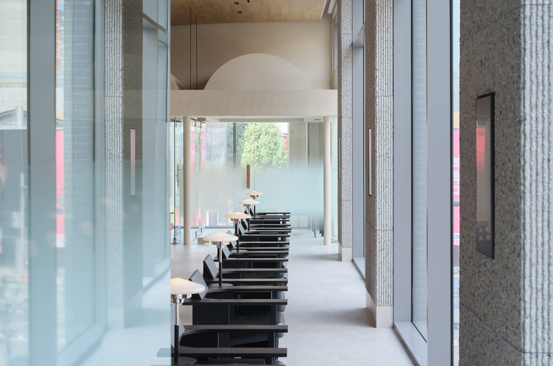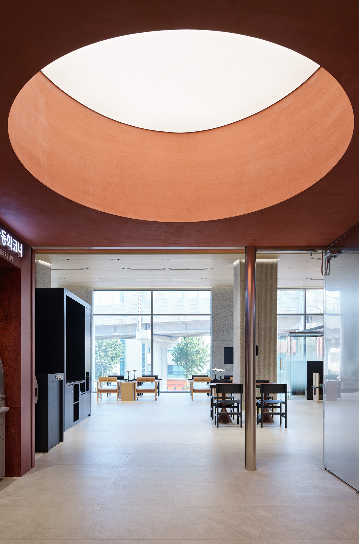 전체적인 공간의 리듬을 형성하는 요소는 높은 층고의 지붕과 중앙에 자리한 네 개의 기둥이다. 유려한 포물선 형태의 지붕과 네 개의 기둥이 조화를 이루며 공간에 개방감과 깊이를 더해준다. 특히 건물의 중심을 지탱하는 네 개의 기둥은 층고를 따라 위로 뻗어 지붕을 받치고, 상부 천장과 분리되어 있어 개방적인 분위기를 만들어낸다. 각 기둥에는 순서를 확인할 수 있는 디스플레이가 설치 되어 있어, 고객들이 대기 중에도 창밖의 경관을 감상하며 순서를 확인할 수 있는 효율적인 공간으로 구성되어 있다.