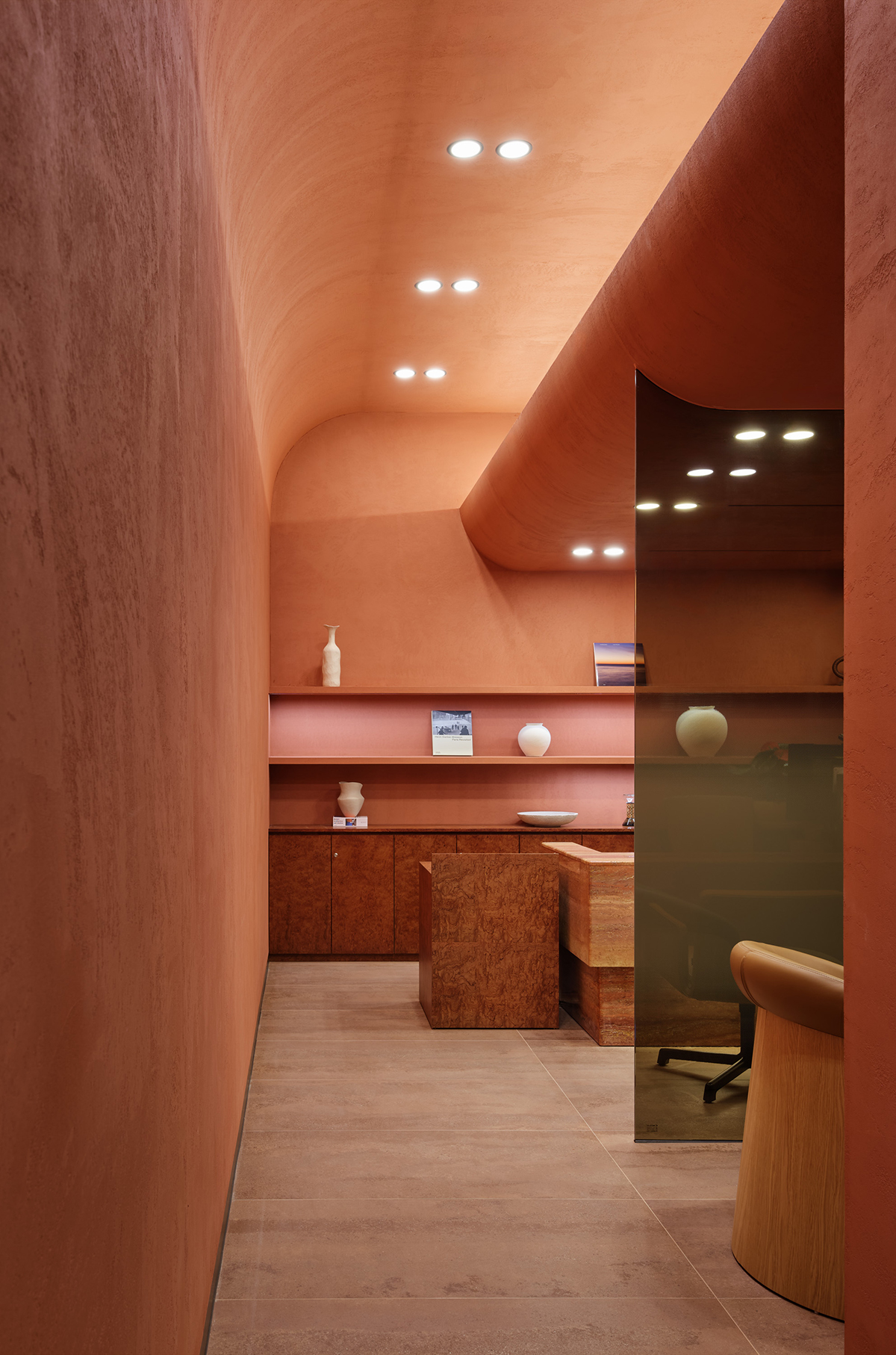입구에 들어서면 낮은 천장을 통한 극적인 진입 효과가 먼저 눈에 들어온다. 붉은 무늬목과 곡선형의 흰 벽이 모던하면서도 부드러운 조화를 이루며 고객을 맞이하고, 커다란 원형의 천장 조명은 은은한 조도로 공간에 깊이를 더해준다. 이 진입로를 지나면, 낮은 천장에서 시작되어 높은 층고로 이어지는 극적인 전환이 이루어지며 고객을 새로운 공간으로 이끈다.
