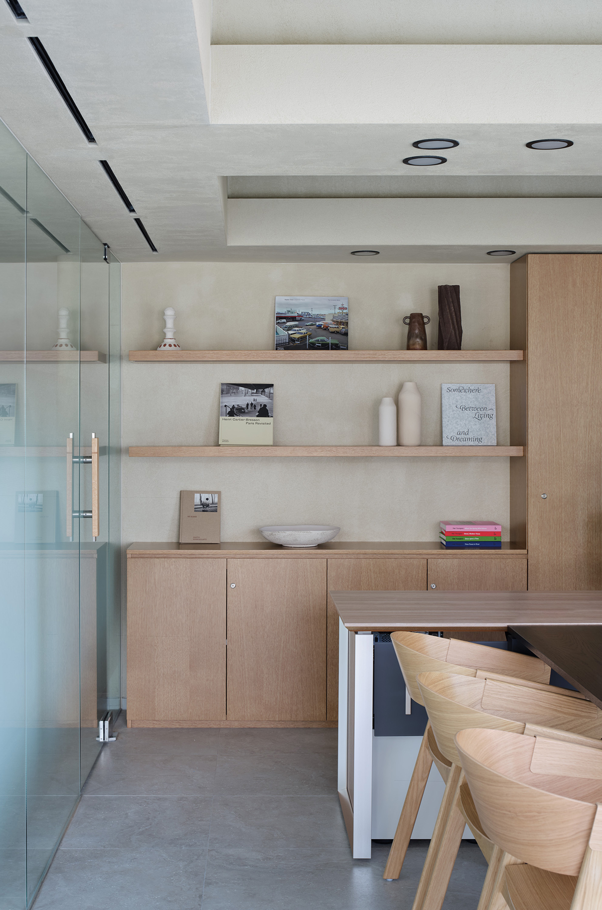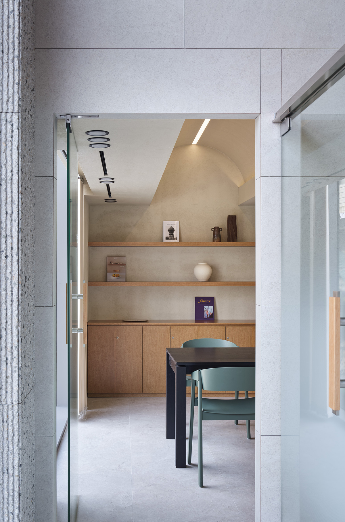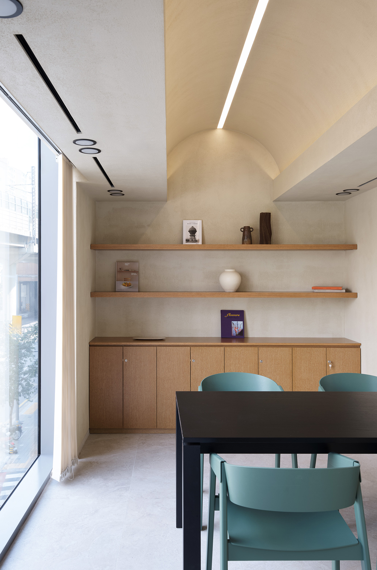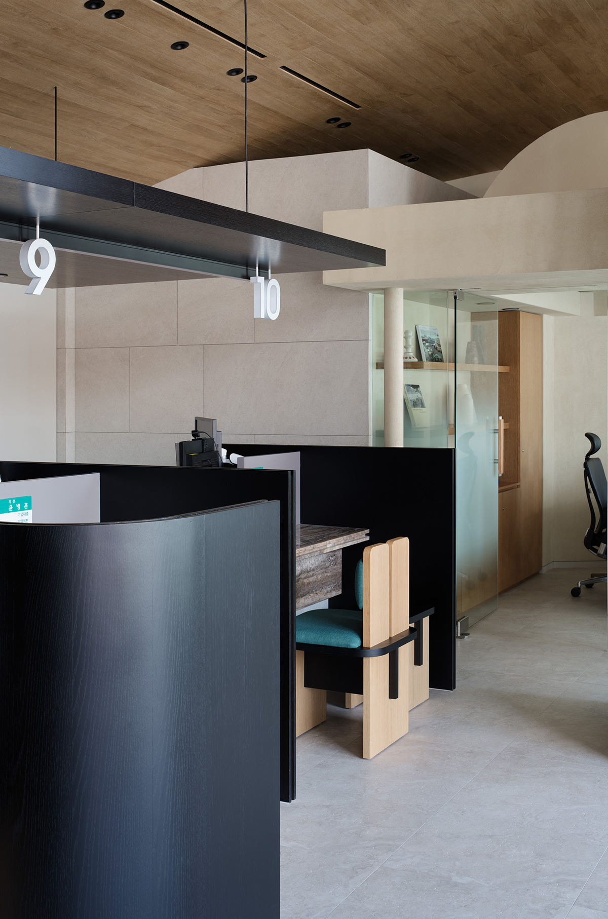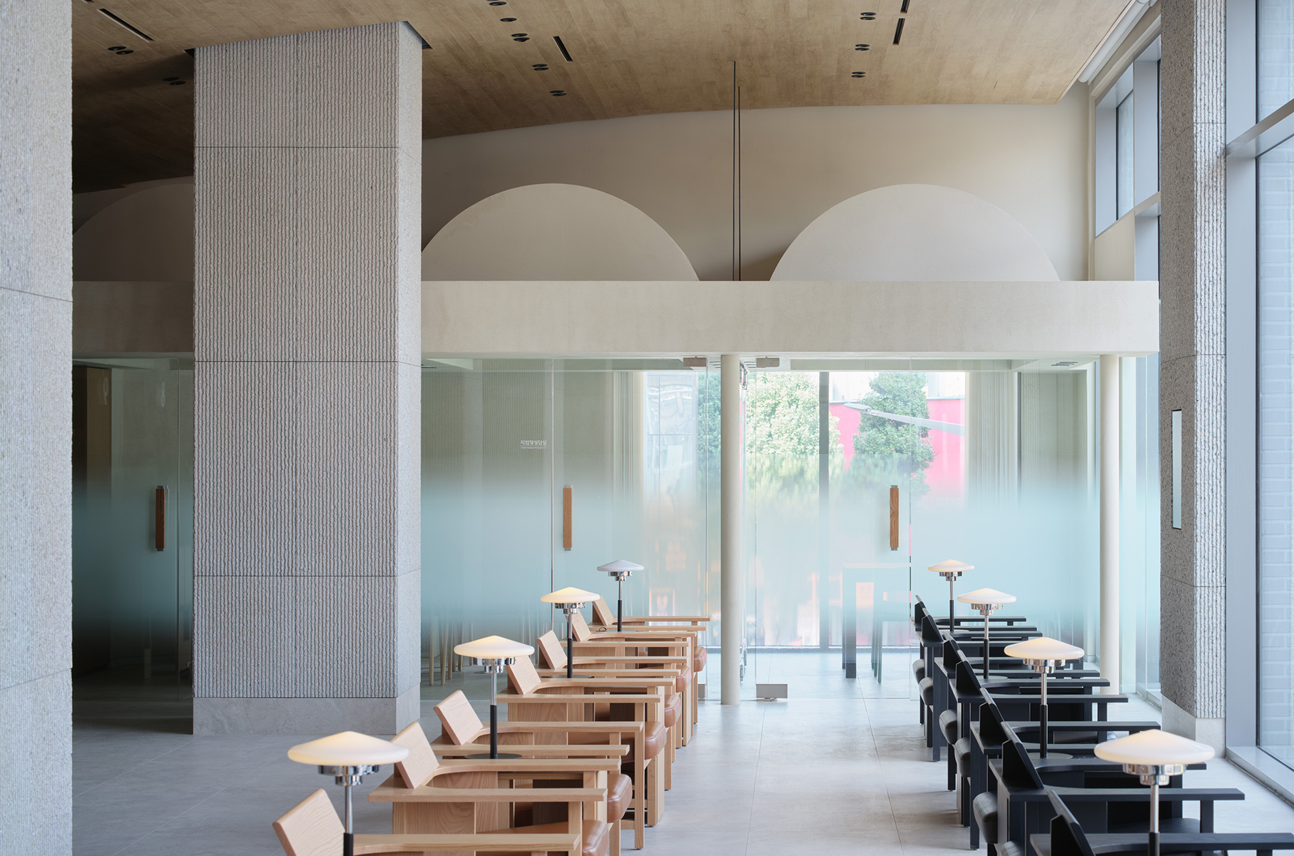 아치형 볼륨감이 돋보이는 독특한 매스의 지점장실은 단연 눈길을 끈다. 실내에서 돔 형태의 천장과 큰 창을 통해 개방감을 더하며, 이 공간만의 독립적이고 특별한 분위기를 자아낸다. 또한, 폴딩 도어를 통해 유연하게 공간을 분리할 수 있어 다양한 상황에 맞게 활용할 수 있도록 설계되었다.